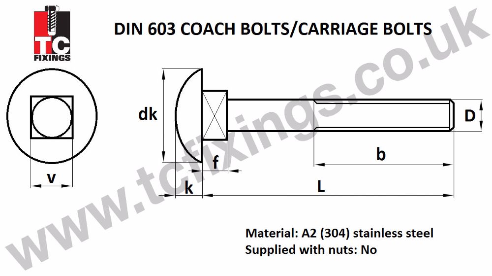 Coach bolts, also commonly known as carriage bolts or cup square hex, are a 'self locking' bolt used for timber to timber construction. The square underneath the head pulls into the timber and means you don't need to hold one side of the bolt with a wrench when tightening. Stainless steel coach bolts are a higher tensile strength than normal mild steel coach bolts, and so are not recommended for use in normal structural timber applications where joint movement needs to be accommodated. Stainless coach bolts and carriage bolts are ideal for exterior applications, or applications where the bolt will be exposed to excess moisture.