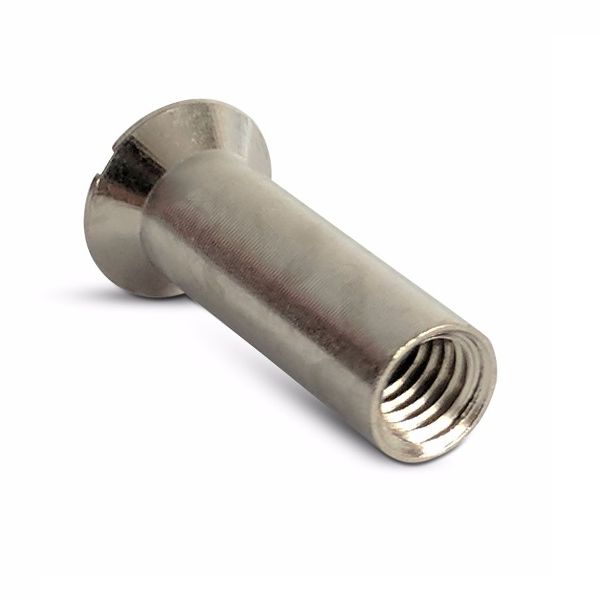 Solid brass sleeve nuts, otherwise known as book nuts, are a threaded sleeve fastener widely used in furniture manufacturing. These have a decorative raised countersunk head slot with a slot drive, making them more aesthetically pleasing than traditional furniture bolts.