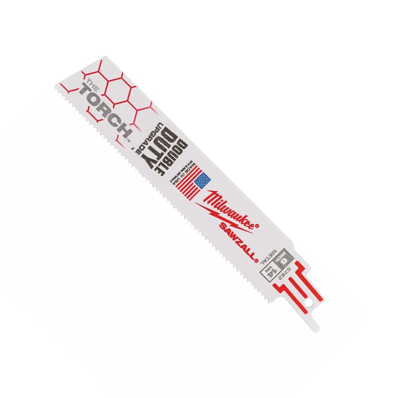 The Milwaukee 'TORCH' range of reciprocation saw blades are a range of heavy-duty demolition blades for use on metal. They feature a strong, 1.06mm thick body and a bi-metal blade that is designed to flex during use to reduce the chance of shattering. The blades are 25mm high - much higher than a wood blade - and this is providing extra stability when sawing through tough metals.