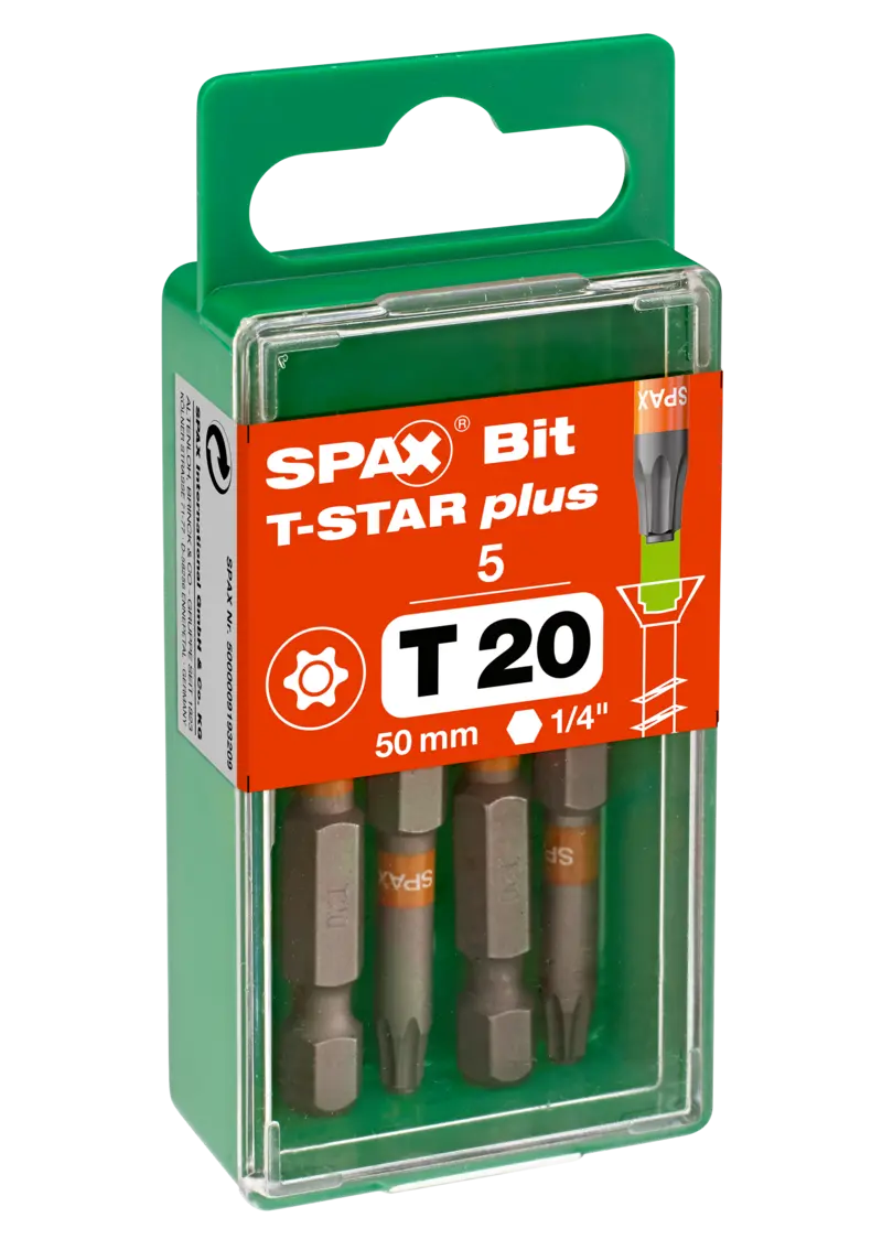 The SPAX T-STAR plus bits are designed to perfectly match SPAX screws, offering superior power transmission, durability, and precision. These bits, easily identifiable by their orange color coding, are available in blade sizes from T10 to T50 and provide an optimal screwdriving experience.