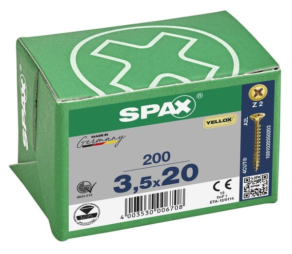 SPAX Universal Screws are designed for versatility, durability, and ease of use, featuring full threads, a flat countersunk head with SPAX's signature 90° MULTI head, and a PZ1 cross recess (pozi) drive. These screws offer clean, flush finishes and eliminate the need for pre-drilling or countersinking, thanks to innovative 4CUT technology that reduces wood splitting and torque requirements. Coated with YELLOX, an eco-friendly chromium(VI)-free finish, these screws provide excellent corrosion resistance, making them perfect for indoor applications. Experience efficient, reliable, and environmentally conscious fastening with SPAX Universal Screws.