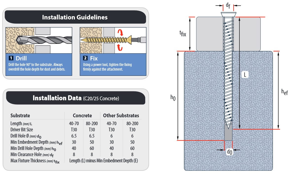 The TIMco Multi-Fix concrete screw offers a rapid and effective light duty anchoring system for fixing into concrete, brick, stone, concrete block and wood. This through fixing provides a single solution and replaces traditonal fixings such as nylon frame and hammer fixings. The special thread configuration taps its own thread within the substrate and eradicates the problems associated with expansion anchors, such as splitting. It also allows the user to adjust the screw ensuring a secure and accurate installation.