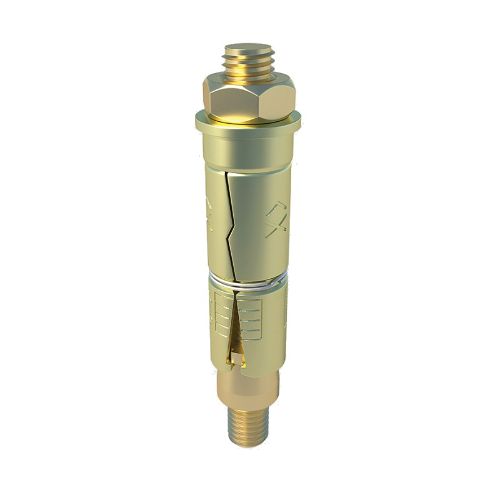 Shield anchors are a very popular and widely used expansion anchor for use into masonry. They have a three-piece segmented body which is held together by a split ring, which then expands when the fastener is tightened and pulls the expansion cone back into the body of the sleeve. This is a 'projecting bolt' shield anchor which means it comes complete with a 5.8 mild steel stud.