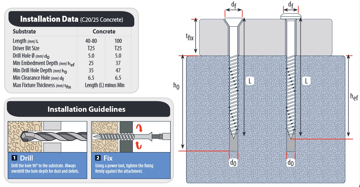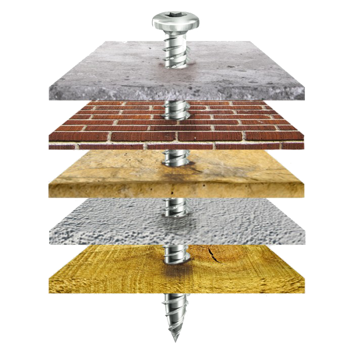 The TIMco Multi-Fix screw offers a rapid and effective light duty anchoring system for fixing into concrete, brick, stone, concrete block and wood. This through fixing provides a single solution and replaces traditional fixings such as nylon frame, hammer fixings and screw & plug. The special thread configuration taps its own thread within the substrate and eradicates the problems associated with expansion anchors, such as splitting. It also allows the user to adjust the screw ensuring a secure and accurate installation.